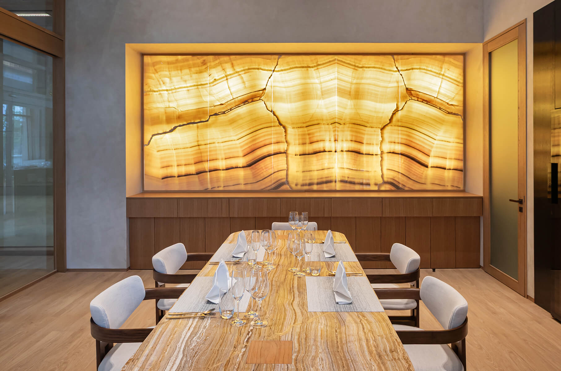 A private dining space with panoramic views beyond glass windows—an elegant and intimate setting ideal for family celebrations or special gatherings.